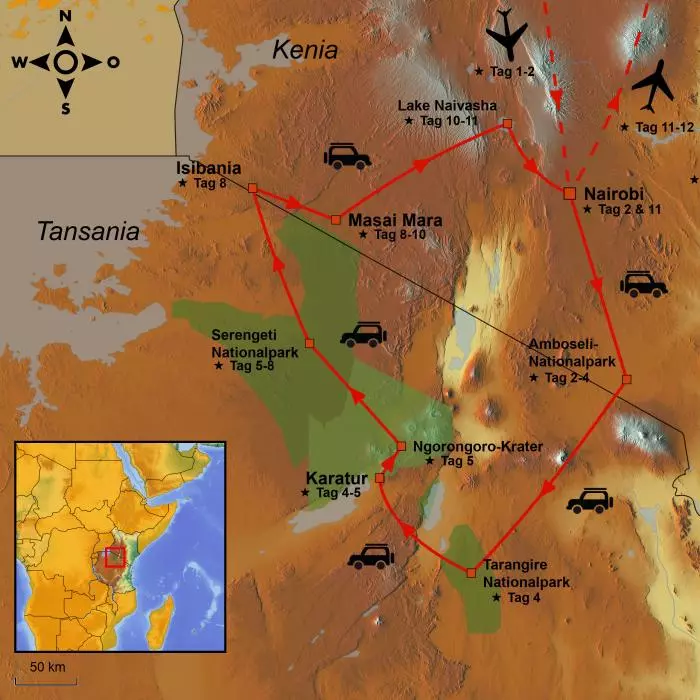 Die Reise beginnt im Amboseli-Nationalpark in Kenia. Den Park kennen Sie sicher von Fotos: Häufig werden Elefanten mit dem Kilimandscharo im Hintergrund fotografiert. Nachdem Sie Tansania kennengelernt haben, überqueren Sie die Grenze und besuchen den Tarangire-Nationalpark in Tansania. Der Park ist besonders für seine Elefanten und die riesigen Affenbrotbäume bekannt. Am Ngorongoro-Krater wartet ein „Jurassic Park“-Erlebnis auf Sie. Die Landschaft ändert sich daraufhin drastisch, Sie reisen zu den gigantischen Ebenen der Serengeti. Dort enden die meisten Safaris. Aber nicht Ihre! Sie überqueren die Grenze noch einmal und reisen nach Kenia zur Masai Mara. Der letzte Stopp der Reise ist der Lake Naivasha, bevor Sie wieder zum Flughafen in Nairobi gebracht werden. Von dort können Sie die Reise mit einem Badeurlaub in Mombasa, auf Sansibar oder auf Mauritius verlängern.