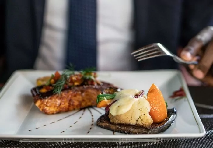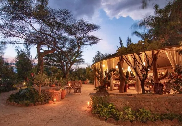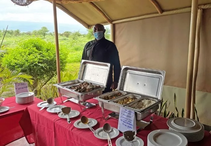 Die Mahlzeiten werden im Restaurant, das teilweise im Freien ist, mit Aussicht auf den Kilimandscharo eingenommen.