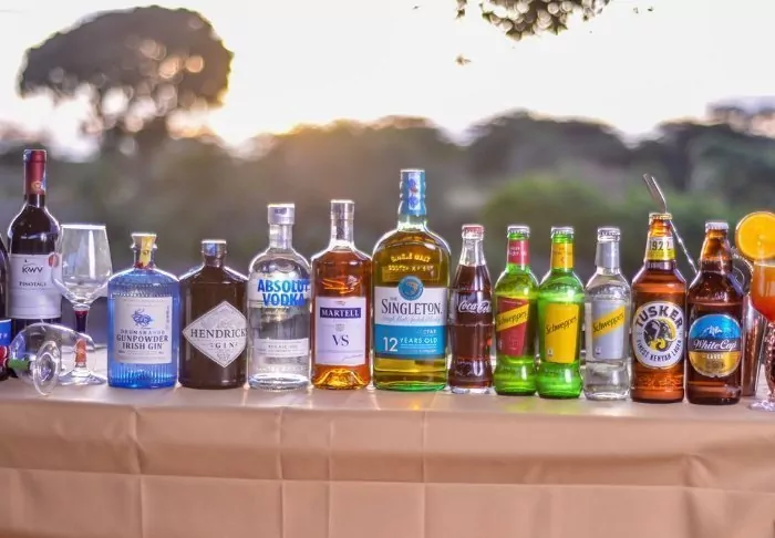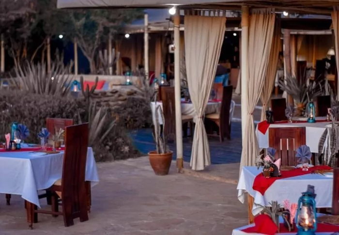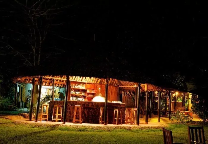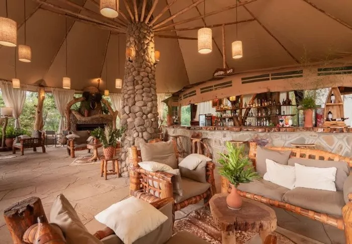 Die Mahlzeiten werden im Hauptgebäude serviert, in dem sich auch die Rezeption und eine gemütliche Bar befinden. An ausgewählten Abenden gibt es gelegentlich Live-Musik in der Bar. Vor dem Restaurant gibt es eine große Rasenfläche mit Bänken und gemütlichen Ecken, um die Aussicht auf das Wasserloch zu genießen. Zwischen dem Restaurant und den Zelten befindet sich ein Pool, umgeben von Sonnenliegen.