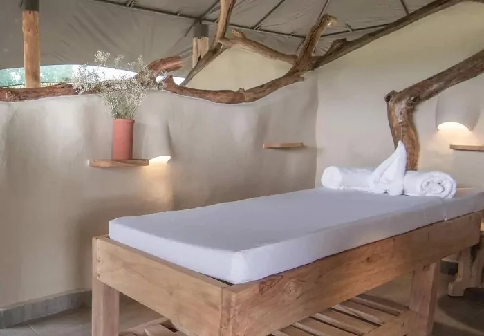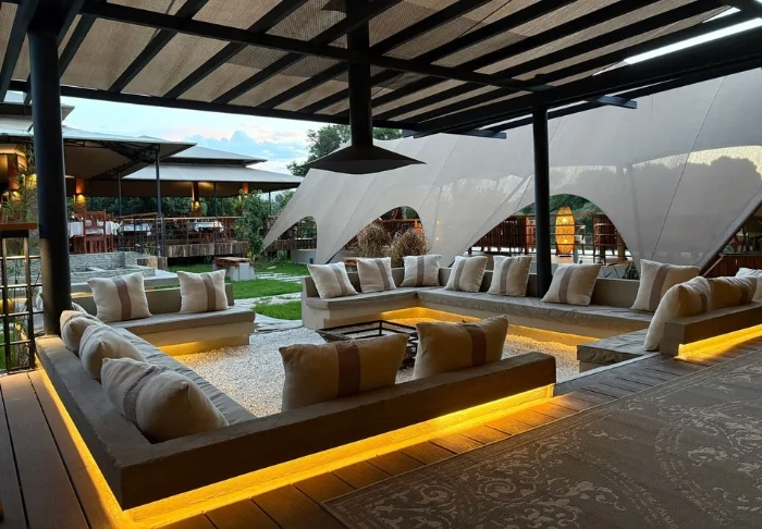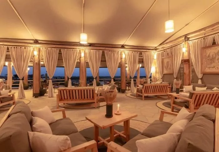 Bar und Restaurant laden zum gemütlichen Beisammensein ein. Hier kann man es sich auf weichen Sofas und in kleinen, flauschigen Ecken gemütlich machen. Beide sind, genau wie die Zelte, mit Naturmaterialien wie Holz und Stein erbaut. Die Farben sind dezent, sodass der Fokus auf die Natur gelenkt wird.