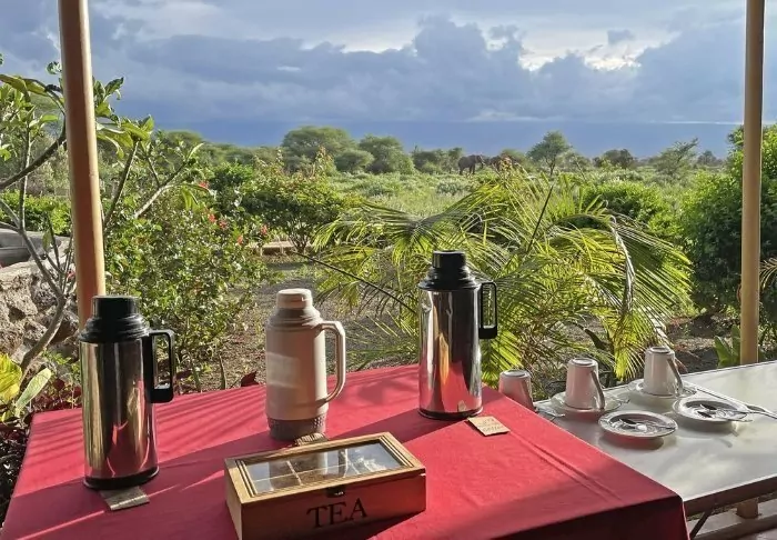 Alle Zimmer besitzen eine eigene Terrasse mit einer wunderschönen Aussicht auf die Ebenen am Fuße des Kilimandscharos.