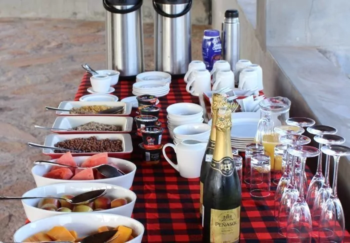 Sie sitzen im großen Zelt. Die riesige Holzplattform vor dem Speisebereich wurde über einer Wiese errichtet, und die Aussicht von dort ist einzigartig. Das Essen und der Kaffee sind himmlisch. Und genau diese Kombination lässt Sie überlegen, ob Sie sich denn wirklich bewegen sollten.