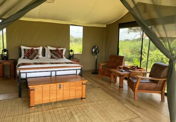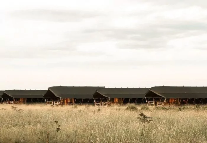 Hier übernachten Sie in einem der 60 großen und geräumigen Zelte, die über die Ebene verstreut sind. Jedes Zelt verfügt über komfortable Betten, eine kleine Sitzecke, einen Kühlschrank, eine Tee- und Kaffee-Ecke sowie eine eigene kleine Veranda und ein eigenes Badezimmer mit Dusche, Waschbecken und Toilette.
