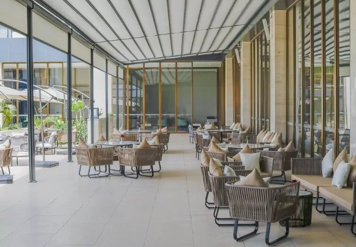 Das Hotel wurde wie ein kleiner Komplex gestaltet, in dessen Mitte ein Garten mit einem Pool an dem einen Ende liegt. Hier finden Sie Sonnenliegen und gleich daneben eine charmante Bar. Das Hotel verfügt außerdem über drei Restaurants, einen Lounge-Bereich und ein Fitnessstudio – und das Beste ist, dass die Fahrt zum Flughafen nur ca. 15 dauert. Der perfekte Ort, um eine Nacht auf der Heimreise oder bei der Anreise zu verbringen.