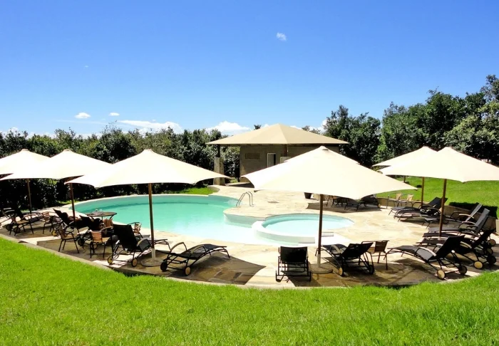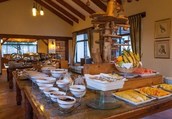 Rund um die Zimmerblöcke erstreckt sich ein riesiger gut gepflegter Garten, der am meisten an einen klassischen europäischen Park erinnert. Aber es ist nicht ungewöhnlich, hier auf Zebras, Giraffen oder Impalas bei einem Spaziergang im Park zu treffen. Wenn Sie viel Glück haben, können Sie die wilden Tiere auch von Ihrem eigenen Balkon aus oder vom Frühstücksrestaurant aus beobachten. Im Park befindet sich auch der herrliche Pool mit viel Platz für Liegestühle.