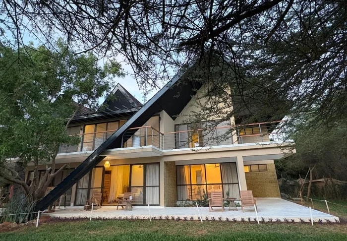 Diese Lodge befindet sich auf großen Weide mit Akazienbüschen und schönen Bäumen.