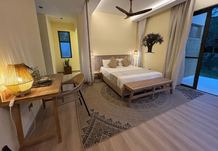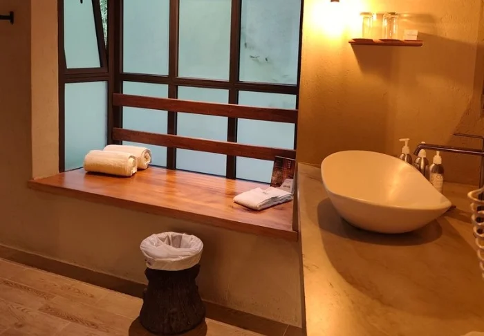 Die Lodge bietet 80 Luxushütten für je 2 Personen, die alle mit Doppelbett und Badezimmer ausgestattet sind. Die Zimmer sind modern und komfortabel eingerichtet. Sie wurden aus Naturmaterialien wie Gummibaum, Felsen aus der Umgebung und Schiefer erbaut.