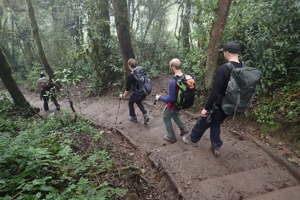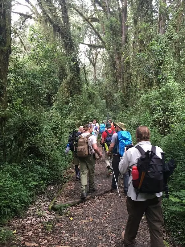 Nach dem Frühstück verlassen Sie Moshi und fahren ca. 45 Minuten zum Marangu Gate, dem südöstlichen Eingang des Kilimandscharo-Nationalparks. Am Marangu Gate werden alle Teilnehmer eingecheckt und registriert und hier treffen Sie auf Ihr Team aus Guides, Köchen und Trägern. Von hier beginnt die Gipfelbesteigung des Kilimandscharos. Sie wandern auf landschaftlich schönen Strecken durch Wälder und Regenwald mit Eukalypten, verschiedenen Vogelarten und mit etwas Glück entdecken Sie den schwarz-weißen Colobus-Affen. In diesen mittleren Höhen kann es feucht und matschig sein. Die Ausrüstung und insbesondere die Schuhe müssen daher einwandfrei sein. Nach der Ankunft im Camp Mandara Hut können Sie sich einfach entspannen. Wenn Sie möchten, können Sie mit Ihrem Guide und anderen Wanderern noch zum Maundy-Krater wandern und die Umgebung erforschen, während die Köche das Abendessen zubereiten.