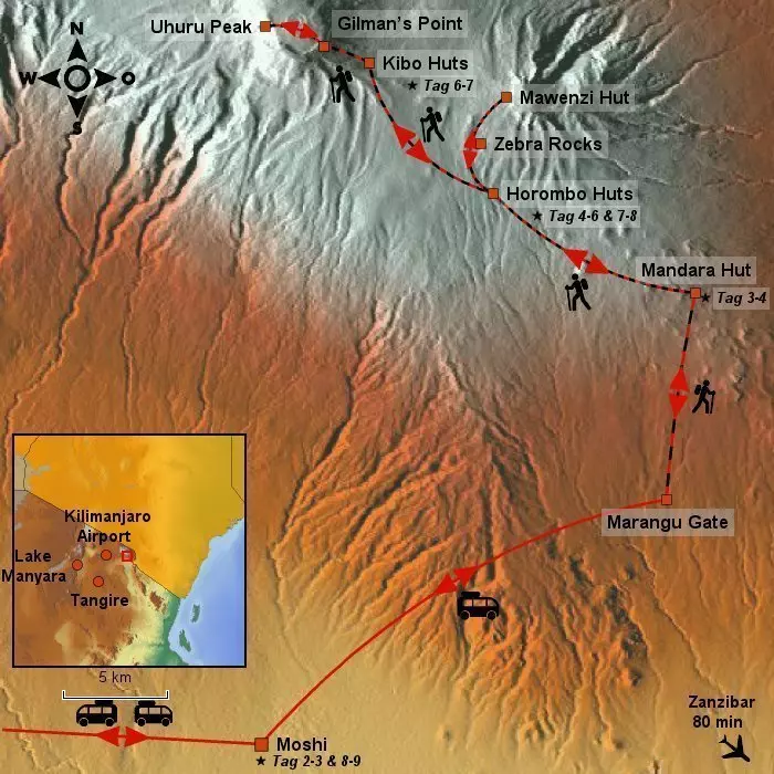 Die Marangu-Route ist auch als Coca-Cola-Route bekannt. Der Startpunkt ist der Marangu Gate, der südöstliche Eingang zum Kilimandscharo-Nationalpark. Sie wandern auf schönen Pfaden durch Wälder und Regenwald. Der Wald lichtet sich und Sie erreichen eine Heidelandschaft mit riesigen Greiskraut-Pflanzen. Der Weg bietet eine herrliche Aussicht auf den Kibo und den Gipfel des Mawenzis. Wir haben einen Tag zur Akklimatisierung vorgesehen, damit Sie sich besser an die Höhe gewöhnen können. Den Tag können Sie dazu nutzen, Mawenzi Tarn Hut oder die Zebra Rocks kennenzulernen. Die Heidelandschaft wird langsam durch eine vegetationslose alpine Landschaft abgelöst, die den Mawenzi mit dem Kibo verbindet. Sie wandern am Gilman’s Point vorbei, dessen Aussicht zum Verweilen einlädt, und steigen dann von Osten hinauf zum Gipfel. Der Abstieg erfolgt an der südöstlichen Seite, wo Sie von vielen Aussichtspunkten einen Ausblick über den Kilimandscharo haben.