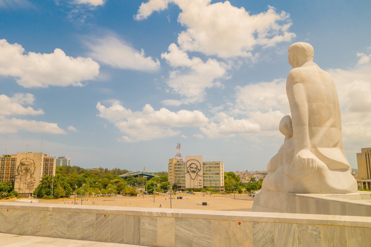Weiter geht es entlang der Strandpromenade El Malecón, vorbei am Hotel Nacionál und der wunderschönen Universität der Stadt, zum riesigen Platz der Revolution, Plaza de la Revolución. Hier wurden viele wichtige politische Reden gehalten. Am Platz der Revolution hängen große Bilder von zwei Revolutionshelden: Che Guevara und Camilo Cienfuegos.