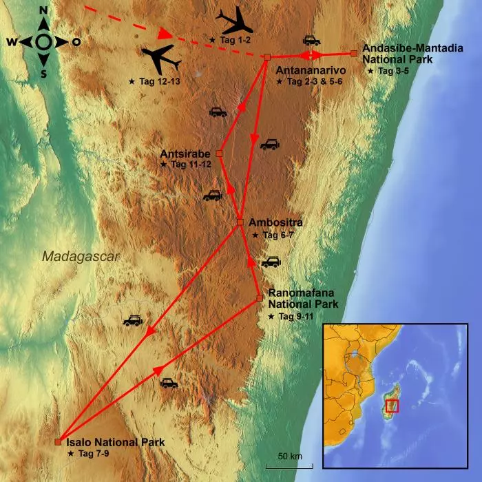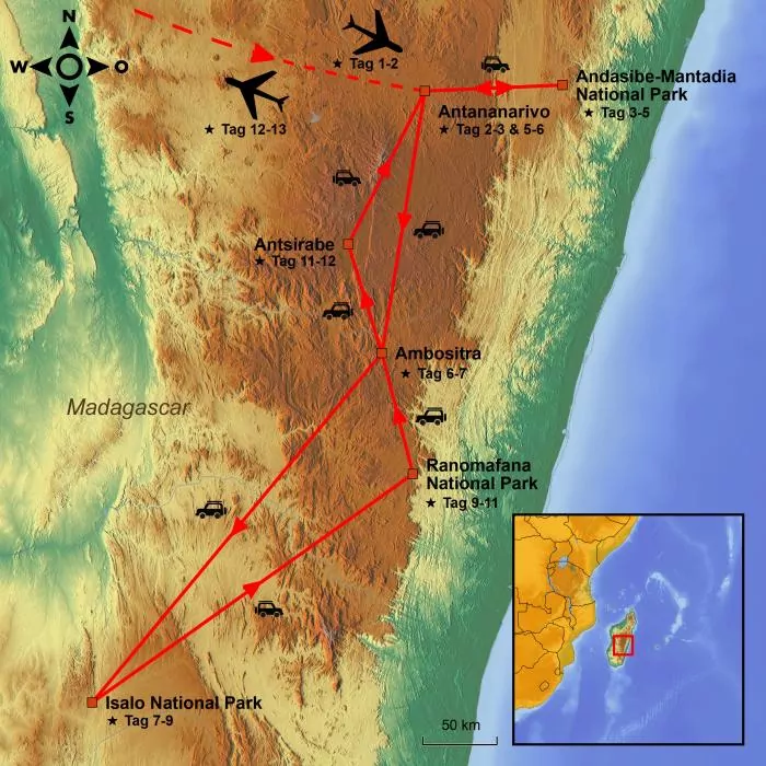 Von hier aus machen Sie sich auf den Weg zu einem echten Roadtrip durch Madagaskar. In einem guten Auto und mit Ihrem eigenen Fahrer entdecken Sie, was von einigen als der achte Kontinent der Welt bezeichnet wird.