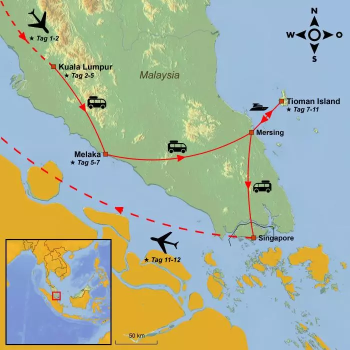 Heute verabschieden Sie sich von dem Flüstern der Geschichte und machen sich auf den Weg zur Insel Tioman. Sie werden von Ihrem Hotel abgeholt und nach Mersing an der Südostküste Malaysias gebracht, eine Fahrt von ungefähr 3,5 Stunden. Von dort aus geht es mit der Fähre weiter in das tropische Urlaubsparadies.