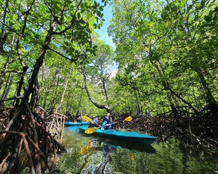 Es ist ein magisches Erlebnis, durch die ruhigen Wasserwege zu paddeln, umgeben von den Klängen der Natur. Unterwegs begegnen Ihnen vielleicht Schlangen, Otter, Warane und verschiedene Vogelarten. Auch die neugierigen Makaken, die in diesem Mangrovengebiet leben, werden Sie wahrscheinlich antreffen.