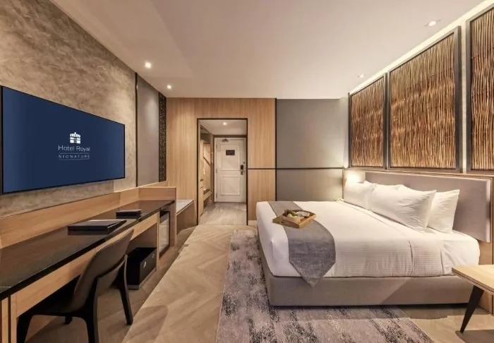 Die Zimmer im Hotel Royal Signature sind wunderschön gestaltet und bieten sowohl Funktionalität als auch Stil. Sie sind geräumig und hell, und Sie werden sich in der entspannenden Atmosphäre schnell wie zu Hause fühlen. Die atemberaubende Aussicht auf den Garten, den Pool oder die Skyline der Stadt runden das Gesamterlebnis ab. Die Zimmer sind mit modernen Annehmlichkeiten wie Klimaanlage, WLAN, Flachbild-TV, Möglichkeit zur Tee- und Kaffeezubereitung, Safe und einer Minibar ausgestattet und bieten alles, was Sie nach einem ereignisreichen Tag in der Stadt brauchen. Das Badezimmer ist ebenfalls schön und modern ausgestattet und verfügt über eine Dusche, weiche Handtücher sowie Pflegeprodukte.