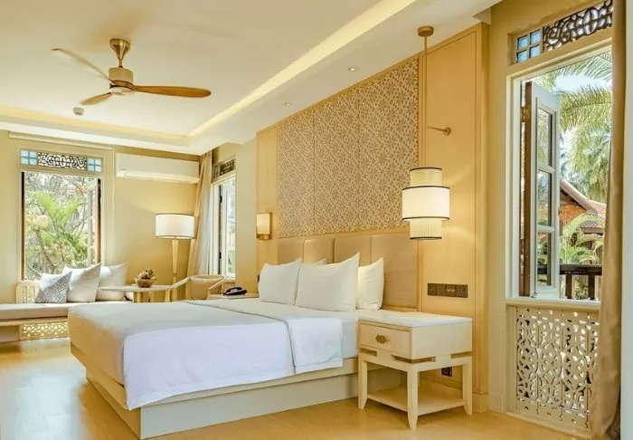 Die 56 Zimmer des Resorts sind geschmackvoll eingerichtet und strahlen mit feinen Details und historisch inspirierten Holzmöbeln klassischen Charme aus, einige mit den exquisiten Seidenstoffen von Jim Thompson verziert. Durch große französische Türen bieten die Zimmer atemberaubende Ausblicke und lassen eine Menge Tageslicht hereinströmen. Jedes Zimmer ist mit modernen Annehmlichkeiten ausgestattet, darunter WLAN, Flachbild-TV, Minibar, Tee- und Kaffeezubereitungsmöglichkeiten sowie ein Ventilator. Die Badezimmer verfügen über eine Badewanne und Dusche, einen Haartrockner, Hausschuhe, einen Bademantel und Pflegeprodukte.