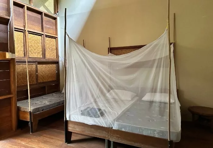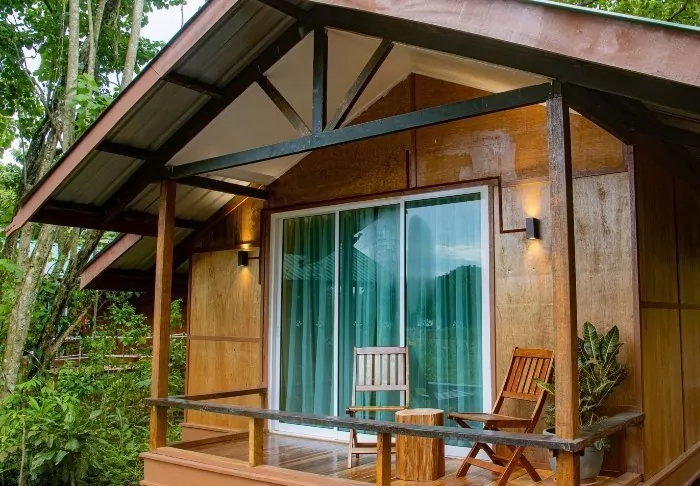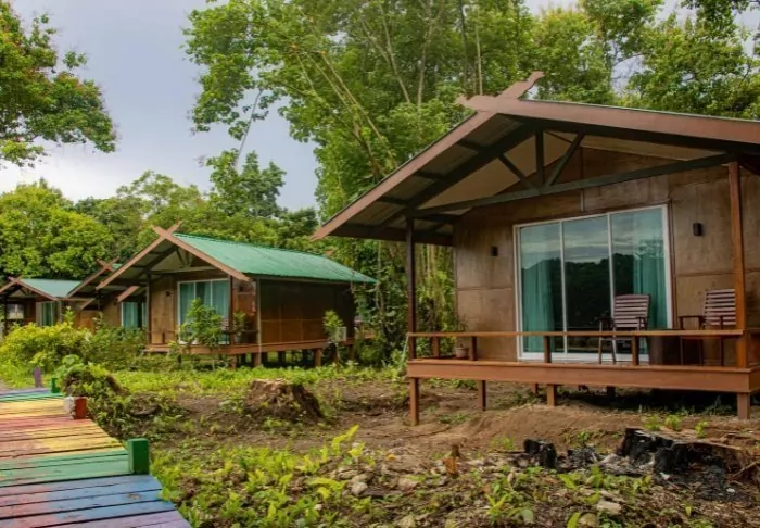 Ihr Aufenthalt in einem der 39 Bungalows der Lodge, die mit einem Deckenventilator oder einer Klimaanlage ausgestattet sind, ermöglicht den Zugang zu einem privaten Badezimmer mit heißer Dusche und umweltfreundlichen Toilettenartikeln. Von der angrenzenden Holzveranda aus können Sie die Stille genießen und sich vom umgebenden Grün bezaubern lassen, während Sie beobachten, wie Nashornvögel, die oft auf dem Gelände der Lodge nisten, vorbeiziehen.