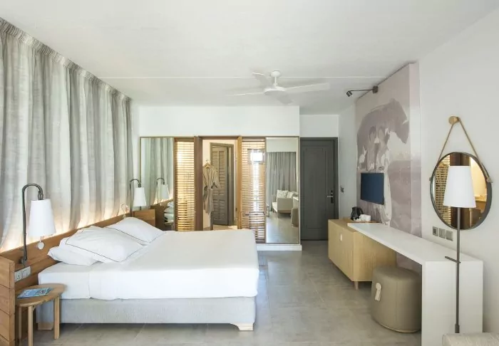 Das Hotel besteht ausschließlich aus großen De Luxe Zimmern, die alle über einen Balkon oder eine Terrasse verfügen und alle einen Blick auf das Meer haben. Alle Zimmer haben entweder ein großes Doppelbett (King Size) oder zwei Einzelbetten. Zu den weiteren Annehmlichkeiten gehören eine Klimaanlage, Telefon mit Voicemail, Safe, Minibar, TV mit mehreren Kanälen, Tee und Kaffee.