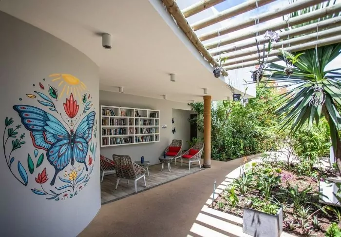 Hier gibt es keine hohen Mauern oder elektrischen Tore. Stattdessen gibt es Hängematten, Sand auf dem Boden in der Lobby und eine gemütliche, charmante und intime Atmosphäre.