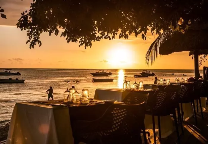 Am Abend können Sie ein Getränk zum Anblick des wunderschönen Sonnenuntergangs über dem Meer genießen. Hinter Ihnen erheben sich die beeindruckenden Berge von Mauritius, vor Ihnen liegt der unter Naturschutz stehende Turtle Bay Marine Park.