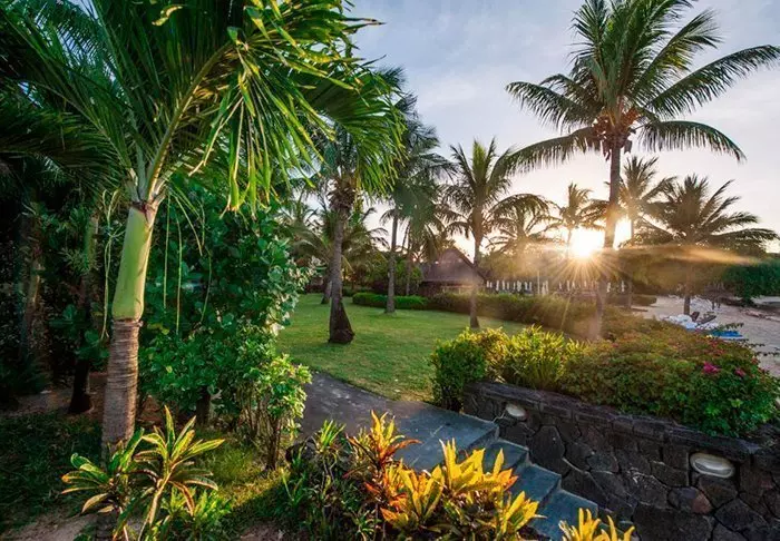 Der Strand selbst befindet sich am Ende des großen blühenden Gartens, in dem auch die Zimmer sind.