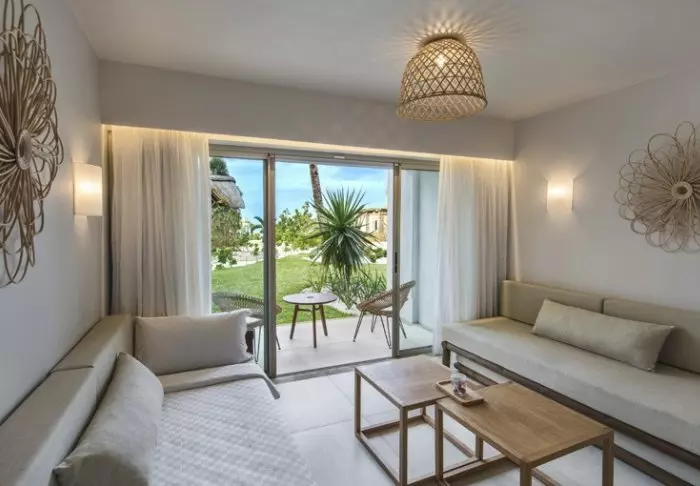 Die 81 Zimmer bieten alle teilweise oder zur Gänze Meerblick. Alle haben natürlich eine Terrasse oder einen Balkon, von dem aus man den ganzen Tag die Aussicht genießen kann. Die Zimmer sind in hellen Farben eingerichtet. Die leichten Materialien tragen dazu bei, dass die Umgebung leicht und luftig wirkt.