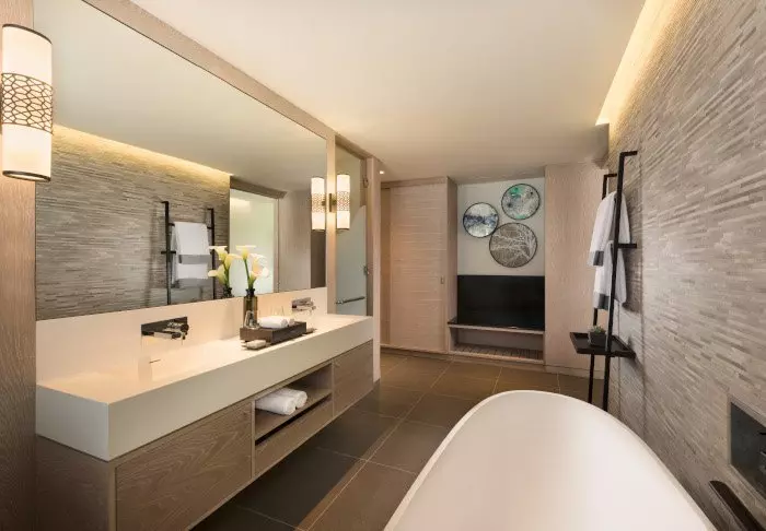 Die 190 Zimmer sind, wie auch der Rest des Hotels, stilvoll eingerichtet. Es ist viel Platz hier. Alle verfügen über einen eigenen Balkon oder eine eigene Terrasse, ein Flachbildschirm-TV-Gerät, eine Tee-/Kaffee-Ecke, eine Minibar, ein Bügeleisen und gratis WLAN.
