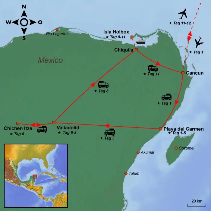 Auf dieser Reise erleben Sie sowohl die bekannten Sehenswürdigkeiten als auch die weniger besuchten Orte der Halbinsel Yucatán. Freuen Sie sich auf die Strände der Strandstadt Playa del Carmen, auf die beeindruckenden Maya-Ruinen von Chichen Itza, auf die farbenfrohe Kolonialstadt Valladolid voller mexikanischem Charme, und auf die charmante Insel Isla Holbox mit ihrer entspannten und unbeschwerten Atmosphäre – der perfekte Ort, um Ihre Reise zu beenden.