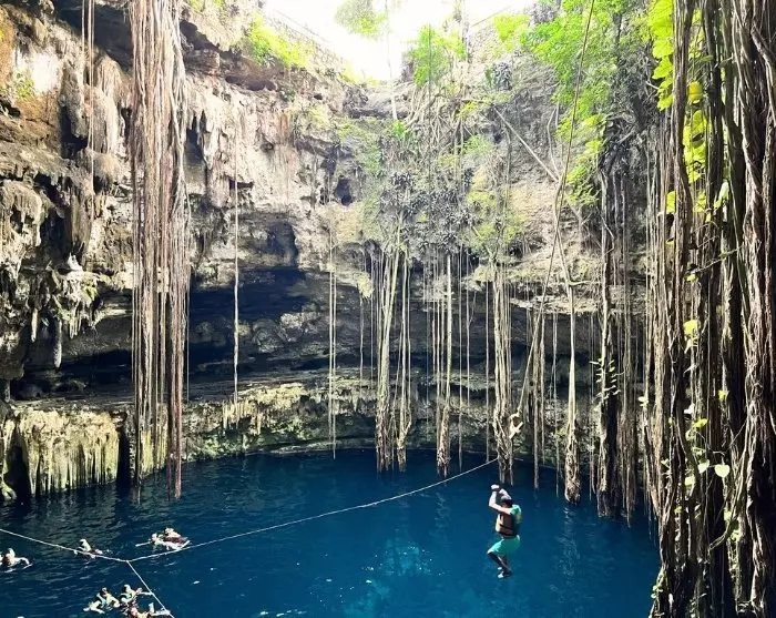 Um 12:00 Uhr fahren Sie weiter zum wunderschönen Cenote San Lorenzo Oxman, wo Sie ein erfrischendes Bad erwartet. Ein Cenote ist ein natürliches, unterirdisches Süßwasserloch, charakteristisch für Yucatán. Der Cenote Oxman ist offen, sodass das Sonnenlicht auf das Süßwasser trifft und die grüne Farbe hervorhebt. Die üppige Vegetation und die Baumwurzeln wachsen an den Seiten des Cenote entlang und verleihen ihm ein absolut märchenhaftes Aussehen. Sie finden Toiletten und Umkleideräume, und gegen eine geringe Gebühr können Sie einen Schrank für Ihre Wertsachen und eine Rettungsweste leihen.