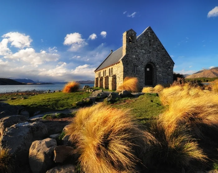 Von Christchurch fahren Sie durch die sanft geschwungenen Canterbury-Ebenen weiter ins zentrale Hochland und zu den schneebedeckten Southern Alps. Der erste Stopp ist am ikonischen Lake Tekapo (Takapō), bekannt für sein kristallklares, türkisblaues Wasser und die kleine steinerne Kapelle, die Church of the Good Shepherd, die vielleicht zu den meistfotografierten Orten des Landes zählt.