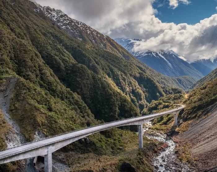 Auf dem Weg nach Osten passieren Sie den Aussichtspunkt Otira Gorge, auch bekannt als Death’s Corner, wo Sie die beeindruckende 440 Meter lange Otira-Viadukt bewundern und vielleicht den verspielten alpinen Papagei Kea entdecken können.