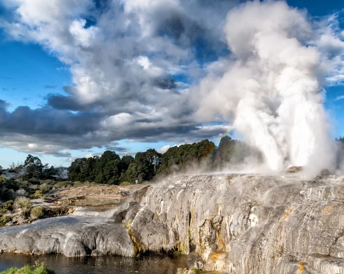 Von hier aus fahren Sie weiter in Richtung Süden nach Wai-O-Tapu, einem farbenprächtigen und spektakulären geothermischen Gebiet, das durch jahrtausendlange vulkanische Aktivität entstanden ist. Dort erwartet Sie eine surreale Landschaft mit blubbernden Schlammtümpeln, dampfendem Boden und heißen Quellen in allen Farben des Regenbogens.