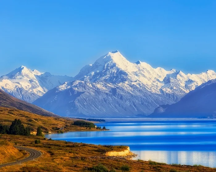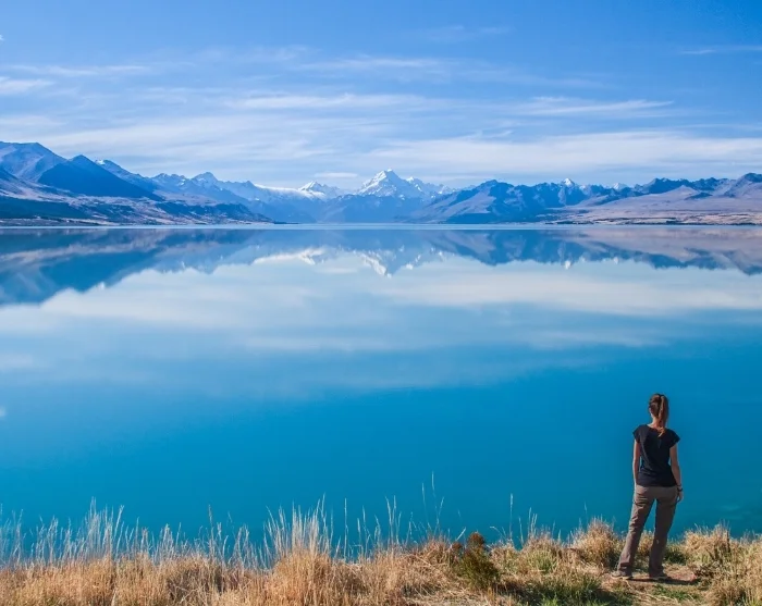 Von hier aus geht es weiter entlang des Lake Pukaki (Pūkahaki), wo allmählich New Zealands höchster Berg, der Mount Cook (Aoraki) mit seinen 3.724 Metern, am Horizont auftaucht.