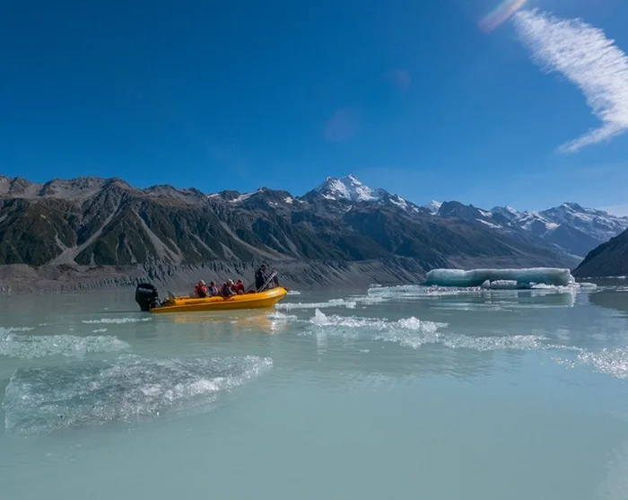 Bevor Sie das Gebiet um den Mount Cook verlassen, könnten Sie eine optionale Bootsfahrt auf dem Tasman Lake in Erwägung ziehen. Hier kommen Sie kleinen Eisbergen und dem Tasman-Gletscher – dem größten Gletscher Neuseelands – ganz nah.