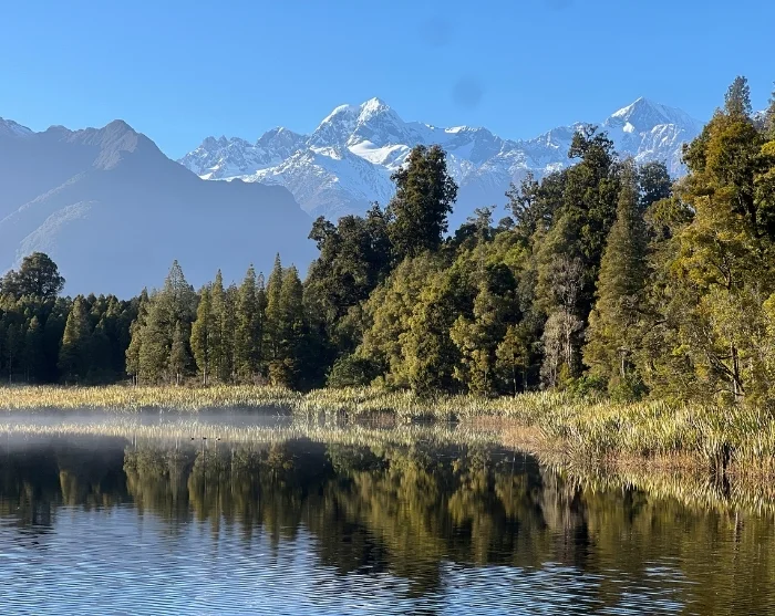 Die Fahrt führt Sie über den Haast-Pass an die Westküste, wo sich die Landschaft verändert und grüner sowie unberührter wird. Bevor Sie Franz Josef erreichen, empfiehlt sich ein Halt am Lake Matheson (Te Ara Kairaumati), der für die schönen Spiegelungen von Mount Cook und Mount Tasman auf der Wasseroberfläche bekannt ist. Dort finden Sie auch den Aussichtspunkt Te Kopikopiko o te Waka, von dem aus Sie bei klarem Wetter den Fox-Gletscher sehen können.
