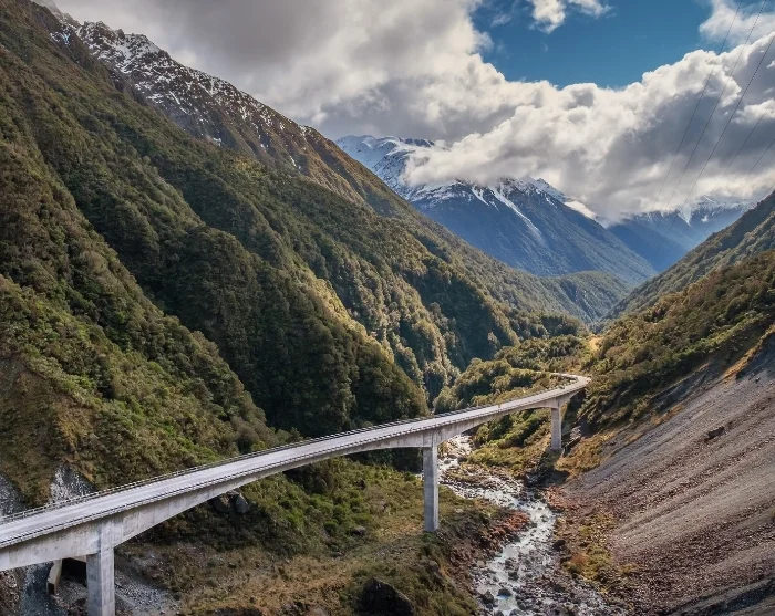 Von hier aus setzen Sie Ihre Reise in Richtung Kumara Junction fort, wo Sie ins Landesinnere durch den Arthur’s Pass Nationalpark abbiegen. Die Landschaft verändert sich schlagartig: Der Regenwald weicht alpinen Sträuchern und steilen Bergen. Am Aussichtspunkt des Otira-Viadukts erwartet Sie ein beeindruckendes Panorama auf den imposanten Viadukt, der sich durch das Tal windet. Halten Sie Ausschau nach Keas, den einzigen alpinen Papageien der Welt, die hier oft zu sehen sind.