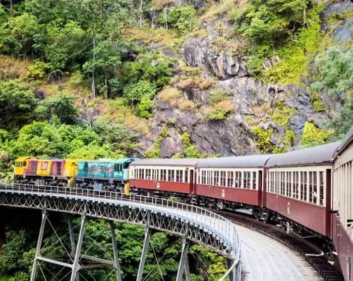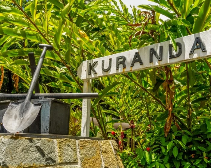 Ein weiteres beliebtes Ausflugsziel ist das idyllische Bergdorf Kuranda. Die Fahrt hinauf führt Sie mit der malerischen Kuranda Railway durch dichten Regenwald, zurück gleiten Sie mit der Skyrail Rainforest Cableway hoch über die Baumkronen und genießen herrliche Ausblicke auf die Landschaft. In Kuranda selbst laden gemütliche Märkte, charmante Cafés und kleine Galerien zum Bummeln ein, bevor Sie nach Cairns zurückkehren.