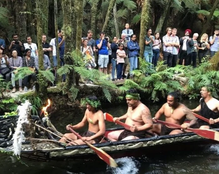 Unter anderem sehen Sie Krieger in einem traditionellen Kriegerkanu (Waka) den Fluss Wai-o-Whiro hinabpaddeln.