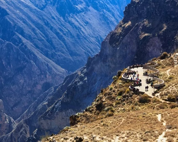 Frühmorgens geht es zum Colca-Tal, einer 3.400 Meter tiefen Schlucht, die zu den tiefsten Schluchten der Welt gehört. Zum Vergleich: Das Colca-Tal ist ungefähr doppelt so tief wie der Grand Canyon in den USA.