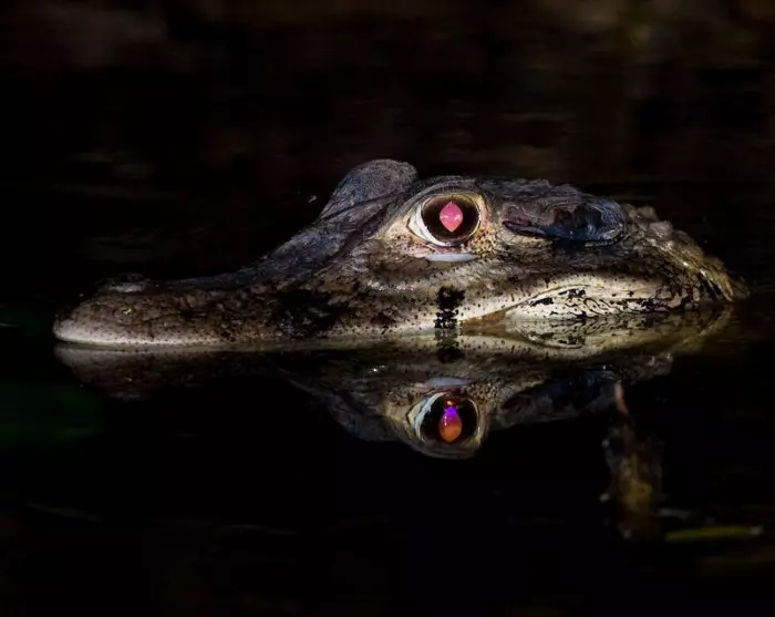 Später an diesem Abend machen Sie eine geführte Bootsfahrt auf dem Fluss, um Kaimane zu beobachten, die am Flussufer leben. Wenn die Kaimane vom Licht der Taschenlampe des Guides geblendet werden, werden ihre Augen rot, wodurch sie leichter zu finden sind.