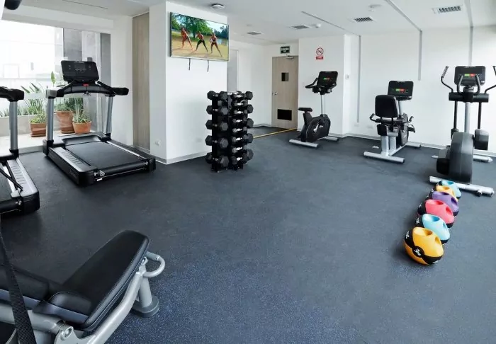 Es gibt auch einen Fitnessraum, damit Sie sich in Form halten können.