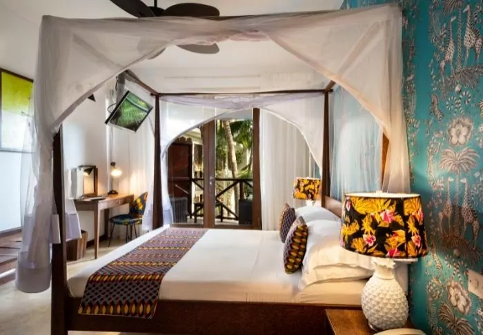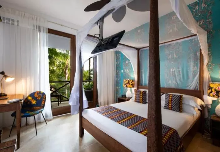 Man sieht dem Hotel an, dass sich die Architekten von Sansibars afrikanischer und arabischer Geschichte inspirieren ließen. Die 45 m² großen Zimmer haben jeweils einen 12 m² großen Balkon oder eine Terrasse, von wo aus man eine herrliche Aussicht auf den Garten und den Indischen Ozean hat. Die Zimmer sind modern und mit leicht afrikanischem Touch und warmen Erdfarben eingerichtet. Alle Zimmer verfügen über ein Himmelbett mit Mückennetz, Klimaanlage, Deckenventilator, Telefon, TV-Gerät, WLAN, Minibar, Sicherheits-Box, CD/DVD-Abspieler sowie Zubereitungsmöglichkeit für Tee und Kaffee.