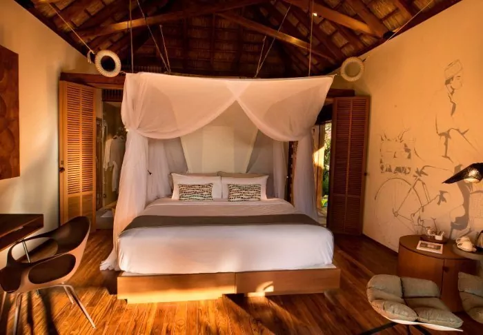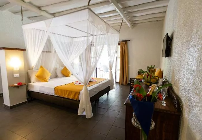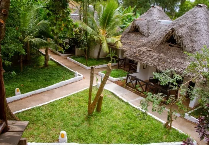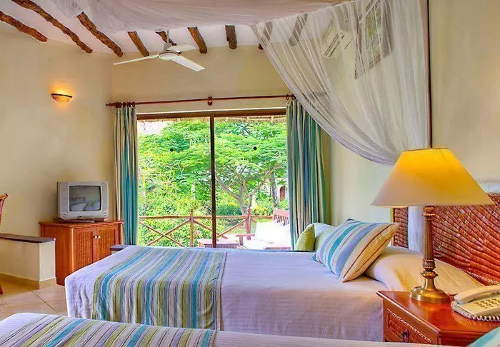 Das Resort besteht aus Rundhütten, im traditionellen afrikanischen Stil erbaut. Alle Zimmer sind Richtung Meer ausgerichtet, Balkon, Klimaanlage, Moskitonetzen, TV, Telefon, Minibar, Badezimmer mit Dusche, WC und Fön.