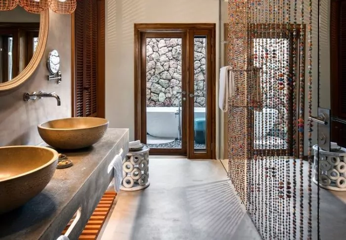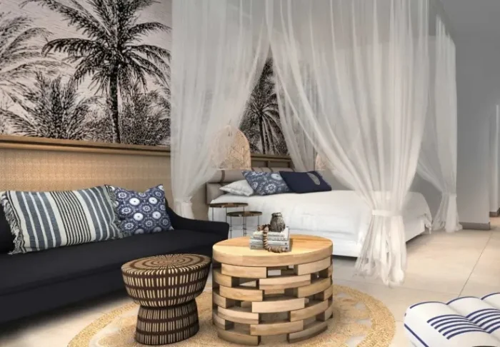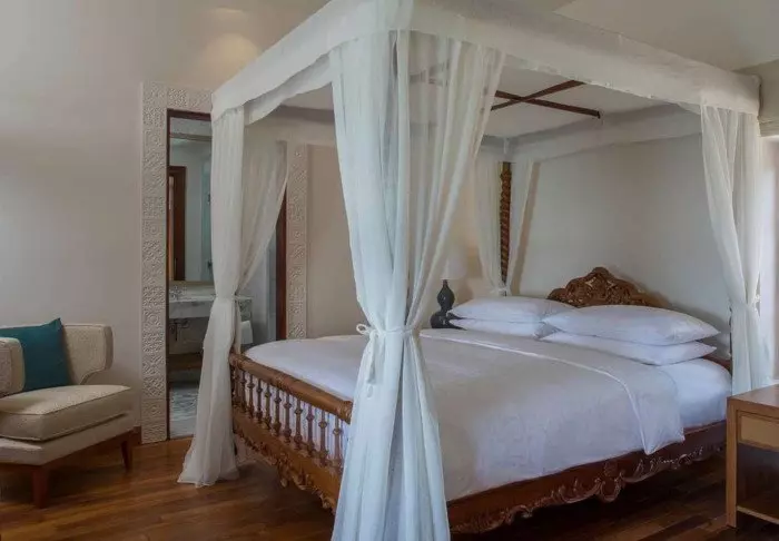 Lediglich 40 Zimmer sind vorhanden, alle eingerichtet mit Kunst an der Wand, bunten Polstern und Lampen, die einen wunderschönen Kontrast zu den Kokosholzmöbeln in den Zimmern bilden. Jedes Zimmer ist außergewöhnlich. Aber alle Zimmer verfügen über eine Klimaanlage, ein Flachbildschirm-TV-Gerät, eine Minibar, einen Safe und WLAN. Alle Zimmer haben außerdem einen eigenen Balkon mit Gartenmöbeln.