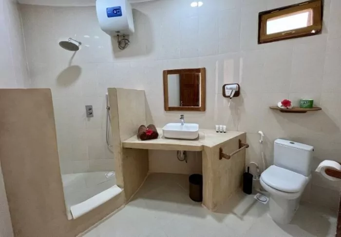 Das Hotel wurde in arabischem Stil eingerichtet, besitzt zauberhaft geschmückte Korridore, antike Möbel und insgesamt 31 Zimmer, zu welchen Sie über elegante Holztreppen oder einen kleinen Lift gelangen. Alle Zimmer sind mit gratis WLAN, Kabelfernsehen, Klimaanlage, Kühlschrank, Kaffee- und Tee-Ecke sowie einem Moskitonetz über dem Bett ausgestattet. Darüber hinaus verfügen sie über ein eigenes Badezimmer mit Föhn sowie einen eigenen Balkon mit Aussicht auf den Swimmingpool im Hof oder das azurblaue Meer.
