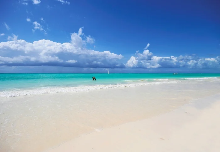 Der Stand ist einfach perfekt. Der Sand ist weiß, das Wasser türkisblau, und aufgrund der speziellen Form des Meeresgrundes wird der Strand weniger von den Gezeiten beeinflusst als dies an anderen Orten der Insel der Fall ist.