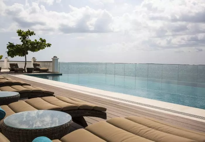 Der Infinity-Pool ist riesig mit einer „Glaswand“ zum Meer hin. Die 150 Meter lange Mole lockt mit Cocktails und dem schönsten Sonnenuntergang auf der Insel, den Sie nach einem langen Tag mit Tennis, Wellness, Kajak, Sonnenbaden, Volleyball, Nickerchen im Schatten, „Reef-Walking“ und vielen Eiswaffeln am Pool – und vielleicht sogar einem Besuch bei der Delfin-Kolonie vor Ort – genießen können.