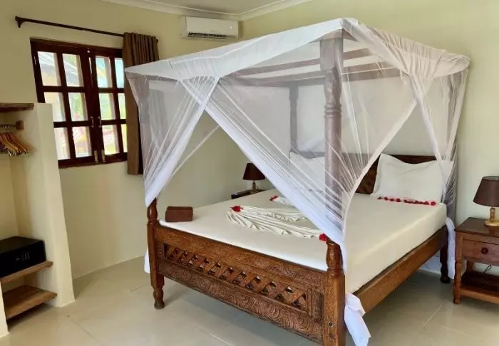 Und die Villen sind wirklich außergewöhnlich: Es gibt einen Aufenthaltsraum, ein Schlafzimmer, ein Bad und eine große Terrasse mit eigenem Pool. Die Einrichtung ist eine geschmackvolle Komposition aus dezenten Farben mit dunklen Mahagonimöbeln in klassischem Sansibar-Stil. Fast im selben Augenblick können Sie spüren, wie Sie sich in dieser ruhigen und weitläufigen Umgebung entspannen, wenn Sie die Villa betreten. Es gibt einfach alles, was man so braucht: TV-Gerät, Klimaanlage, WLAN, Safe, Duschen drinnen und im Freien, Badewanne, Tee- und Kaffee-Ecke usw. Wenn Sie die Türen zu Ihrer eigenen Terrasse öffnen, können Sie dort die Sonnenliegen und den eigenen Pool genießen. Vor der Türe stehen Fahrräder bereit, falls Sie die Umgebung erkunden möchten.
