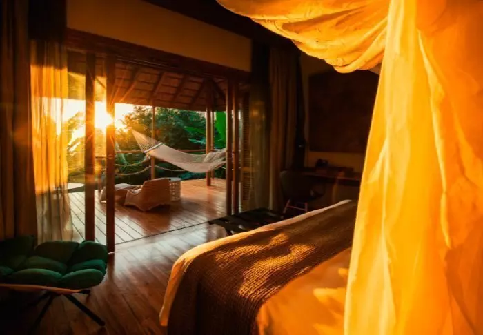 Die Einrichtung aller Bungalows ist von moderner afrikanischer Architektur mit Fokus auf Nachhaltigkeit inspiriert. Es gibt hier alles, was man sich so wünscht. Eine eigene große und toll möblierte Terrasse, ein Bad drinnen und draußen, eine Tee- und Kaffee-Ecke, gratis WLAN, Klimaanlage, Flachbildschirm-TV usw. Gleichzeitig aber herrscht eine unglaublich entspannte und fröhliche Stimmung.