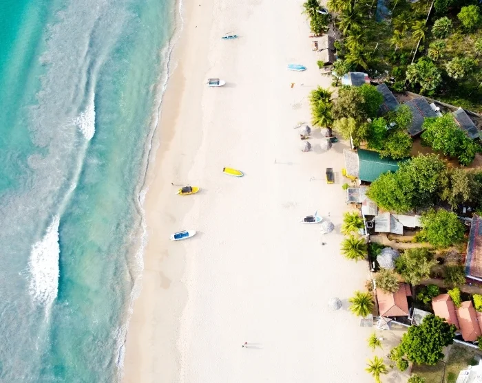 Eine gemütliche Urlaubsstadt mit einem fantastischen Strand, der von Palmen umgeben ist.