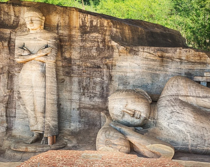 Weiter geht es zum Buduruwagala-Tempel, der ins 10. Jahrhundert zurückreicht und für seine gut erhaltenen Felsenkunstwerke bekannt ist. Der Tempel besteht aus einer großen Felswand mit einer 16 Meter hohen Buddha-Statue, umgeben von sechs kleineren Figuren, die Buddha in verschiedenen meditativen Haltungen darstellen. Ihre filigranen Details und gelassenen Ausdrücke können in aller Ruhe bewundert werden, da Buduruwagala ein ruhigeres Dasein führt als die zuvor besuchten Tempel.